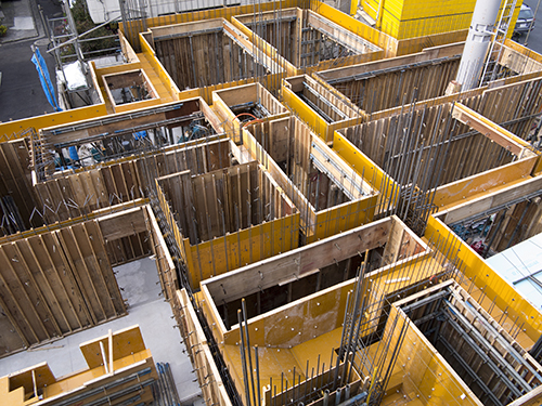 ビルやマンションといった鉄筋コンクリート造の建物を建設するため、壁や柱を形成する枠をつくります。それが「型枠」です。